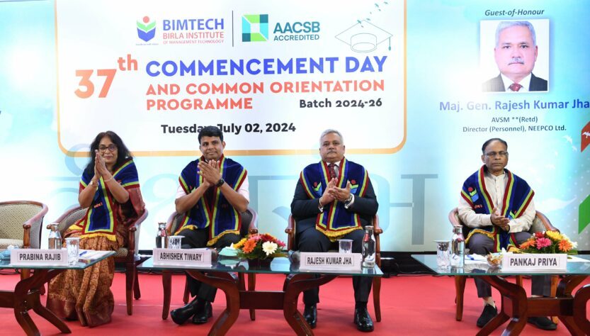 The 37th “Deeksharambh” ceremony was graced by Chief Guest Dr. Abhishek Tiwary, Senior Vice President & Global Head – HR (BPS), Tech Mahindra Ltd. & Global HR Head (designate) KPMG Delivery Network (KDN), Guest of Honour, Maj. Gen. Rajesh Kumar Jha, AVSM (Retd.), Director (Personnel), NEEPCO Ltd., Dr. Prabina Rajib, Director, BIMTECH, and Dr. Pankaj Priya, Dy. Director and Dean-Academics, BIMTECH.