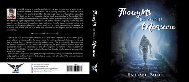 Saurabh Pant is a visually impaired Indian author, born on the 4th of April 1994 in the beautiful hill station of Nainital in Uttarakhand. After having pneumonia at the age of 3 and accepting the loss of vision at age 5, he came in touch with Braille at the age of 12 and had primary education in NIEPVD in Dehradun where he also learnt screen reader access for devices. He returned to inclusion after schooling and graduated from Kirori Mal College in DU where he was a modest student of his time. His writing journey had started to grow in school, but with technical help, he published his 1st work in Sept 2014 and from there onwards he never looked back.